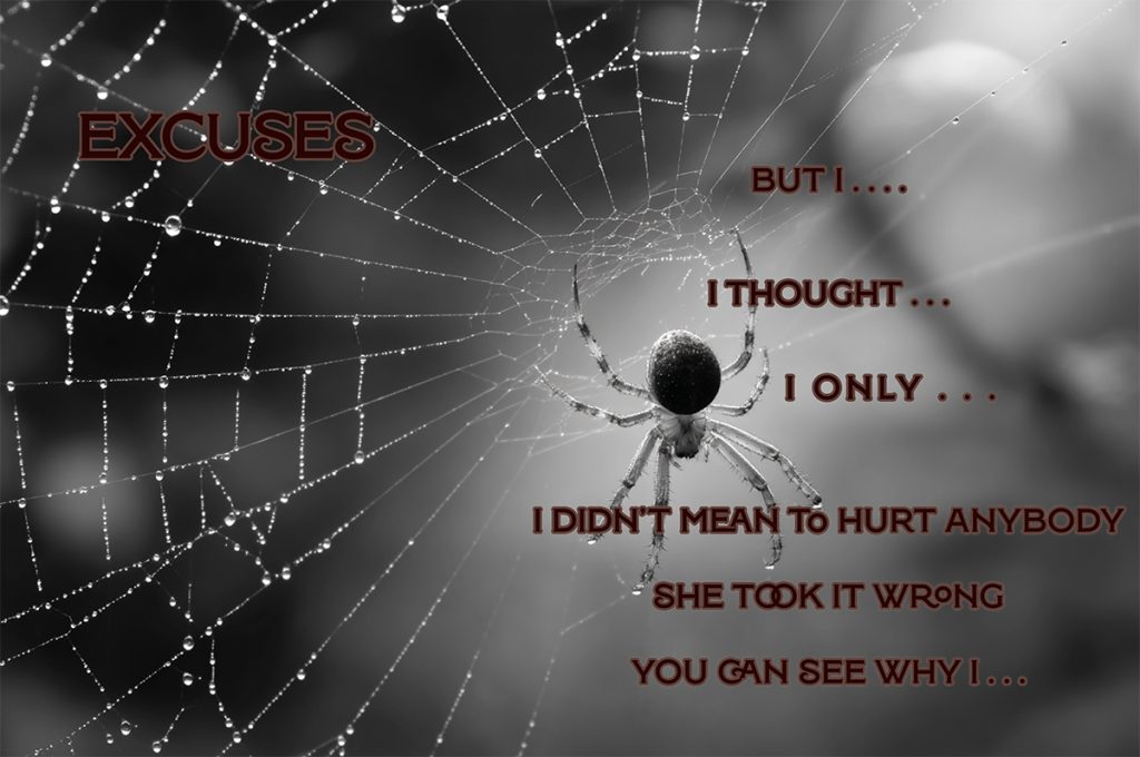 6. When I make excuses for my thoughtless behavior,I’ve fallen into Satan’s territory. He tells me that I’m justified, that I didn’t mean harm, that there were reasons for my selfish behavior. But this tale that I spin about my innocence is a web that entraps me. I can’t get free to repent and start fresh.